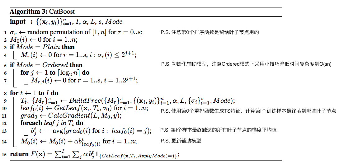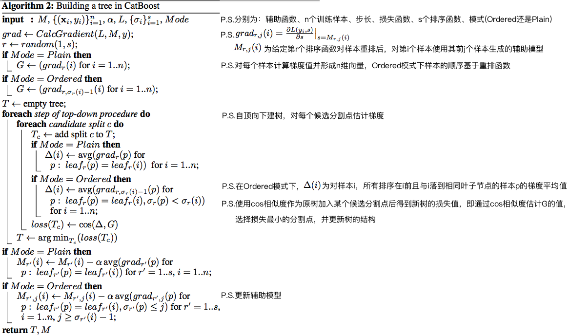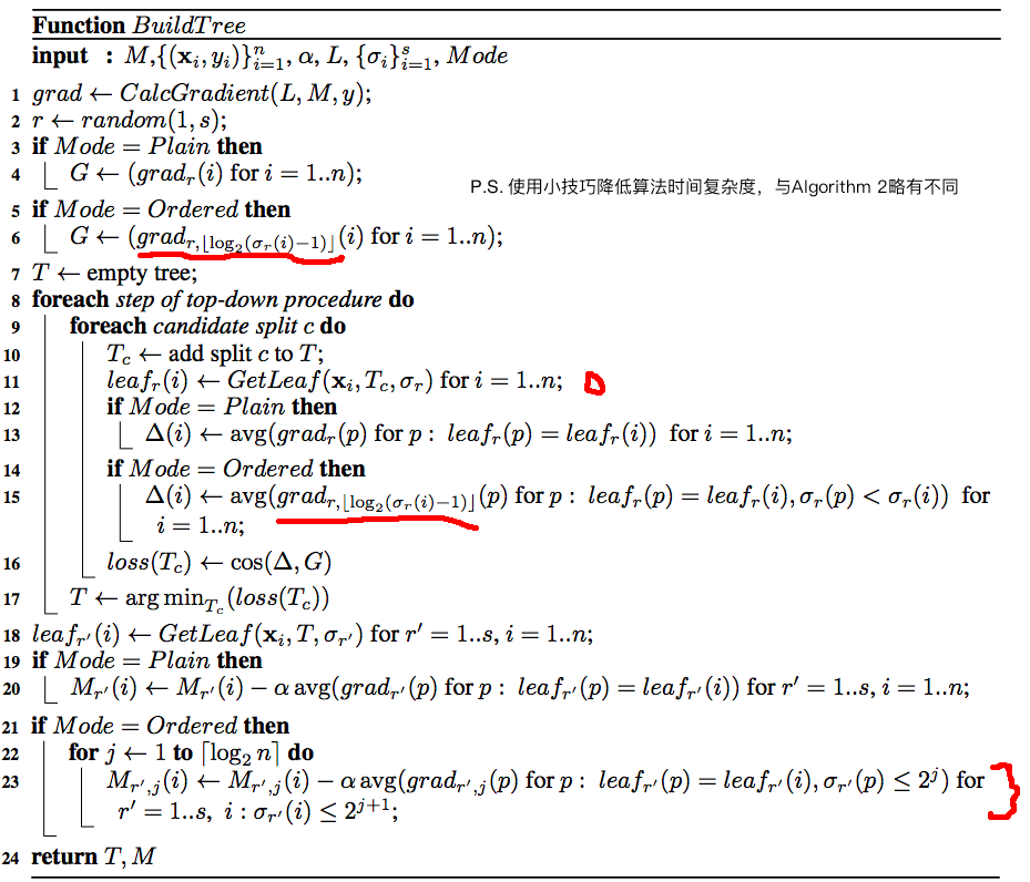 由于要训练\(n\) 个模型,时间和空间复杂度都上升了\(n\) 倍,所以这个算法实操性较低。 CatBoost对建树算法做了改进,有对Algorithm 1 算法效率改进的Ordered模式和类似于传统GBDT的Plain模式,其中Ordered模式在小数据集上优势明显。