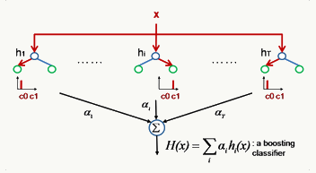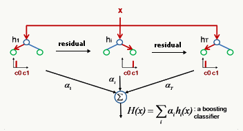 \[ \begin{array}{l} f_0(x)=0\\ \text{for $i$=1 to $T$:}\\ \qquad minimize~\sum_{i=1}^NL(y_i,F_t(x_i)+\alpha_tf_t(x_i))\\ \qquad F_{t+1}(x)=F_t(x)+\alpha_tf_t(x)\\ \\ \text{The final is weighted average of the outputs from all the weak classifiers:}\\ F(x)=\sum_{i=1}^T\alpha_if_i(x)\\ \end{array} \]