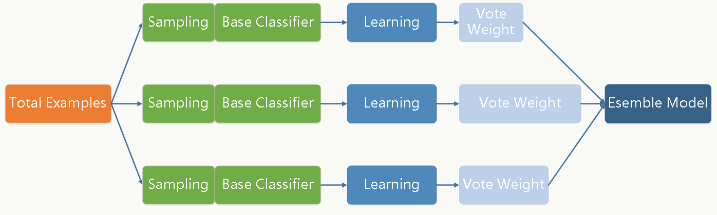 假设任务是学习一个模型 \(y=f(x)\) ,我们通过抽样生成生成\(N\) 个数据集,并训练得到\(N\) 个基础分类器\(c_i......c_N\) 。