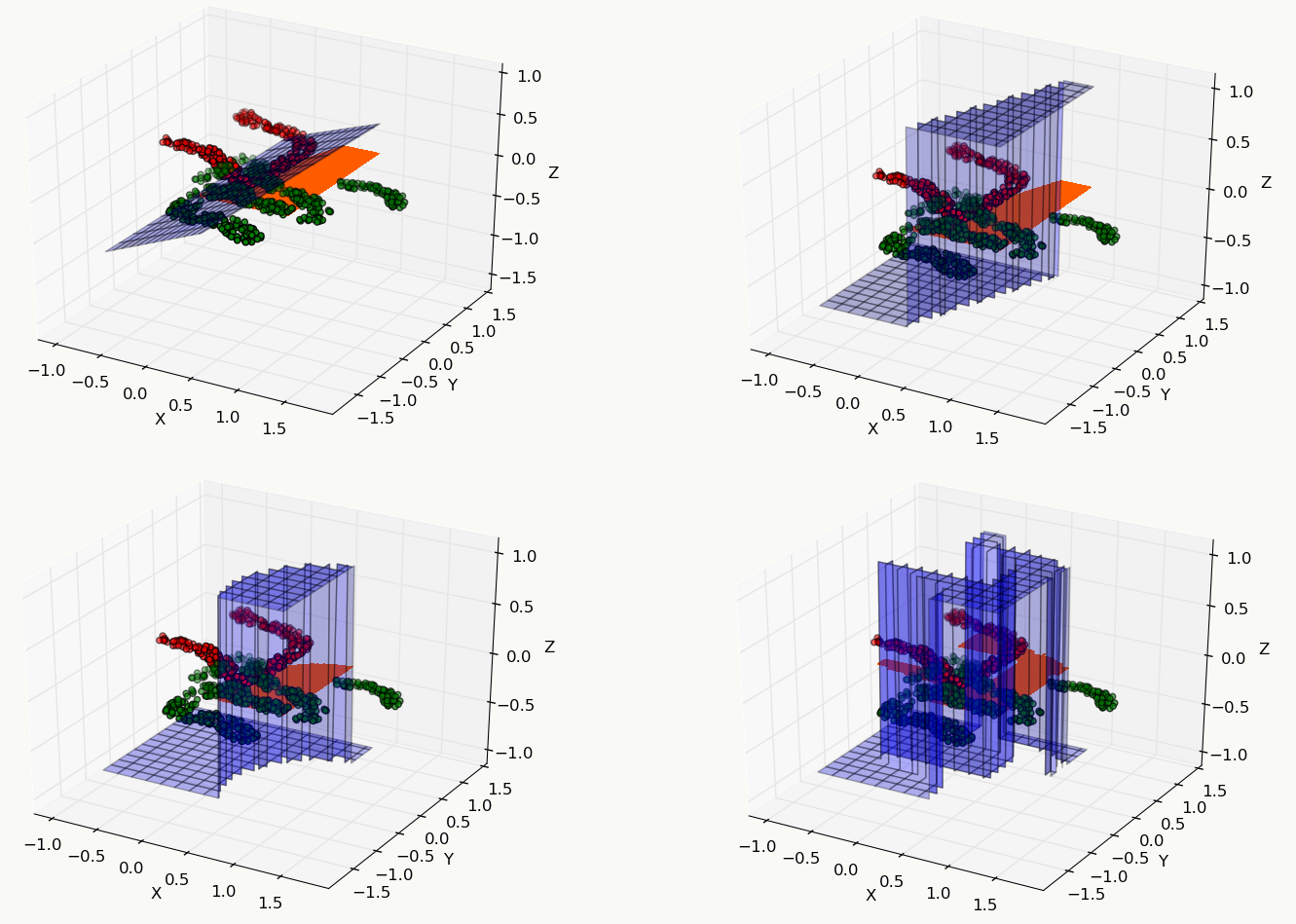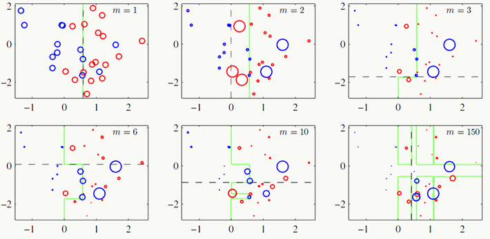 2.5.2 AdaBoost with trees AdaBoost with trees通过训练多个弱分类器来组合得到一个强分类器,每次迭代会生成一棵高偏差、低方差 的树形弱分类器,每一轮的训练会更关注上一轮被分类器分错的样本,为其加大权重,训练过程如下: