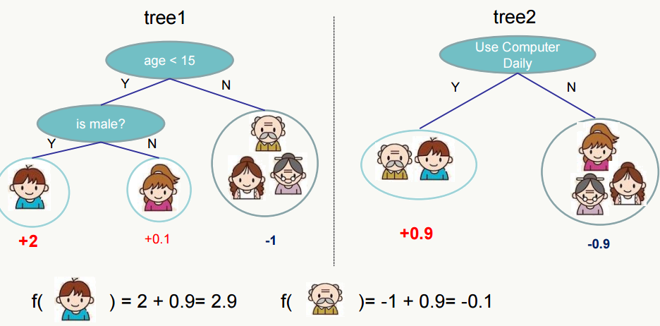 \[ \begin{array}{l} F(x)=\sum_{i=1}^Nw_if_i(x)\\ \text{where }f_i\text{ is the output of tree }i\\ \qquad\qquad\qquad w_i \text{ is the weight of tree }i\\ \qquad\qquad\qquad x \text{ is the feature vector of instance} \end{array} \]