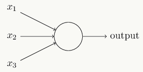 \[ \begin{array}{l} output & = & \left\{ \begin{array}{1} 0 & if~ \sum_j w_j x_j + b \leq 0 \\ 1 & if~ \sum_j w_j x_j + b> 0 \end{array} \right. \end{array} \]