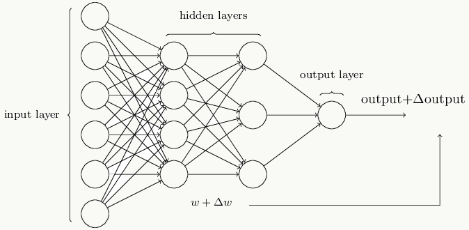 其中最左边是输入层,包含若干输入神经元,最右边是输出层,包含若干输出神经元,介于输入层和输出层的所有层都叫隐藏层,由于神经元的作用,任何权重的微小变化都会导致输出的微小变化,即这种变化是平滑的。