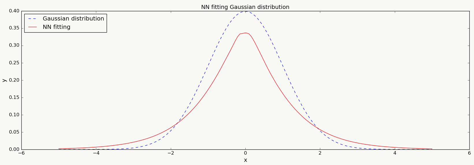 1 2 3 4 5 6 7 8 9 10 11 12 13 14 15 16 17 18 19 20 21 22 23 24 25 26 27 28 29 30 31 32 33 34 35 36 37 38 39 40 41 42 43 44 45 46 47 48 49 50 51 52 53 54 55 56 57 58 59 60 61 62 import numpy as np import matplotlib matplotlib.use('Agg') import matplotlib.pyplot as plt import random import math import keras from keras.models import Sequential from keras.layers.core import Dense,Dropout,Activation def gd(x,m,s): left=1/(math.sqrt(2*math.pi)*s) right=math.exp(-math.pow(x-m,2)/(2*math.pow(s,2))) return left*right def pt(x, y1, y2): if len(x) != len(y1) or len(x) != len(y2): print 'input error.' return plt.figure(num=1, figsize=(20, 6)) plt.title('NN fitting Gaussian distribution', size=14) plt.xlabel('x', size=14) plt.ylabel('y', size=14) plt.plot(x, y1, color='b', linestyle='--', label='Gaussian distribution') plt.plot(x, y2, color='r', linestyle='-', label='NN fitting') plt.legend(loc='upper left') plt.savefig('ann.png', format='png') def ann(train_d, train_l, prd_d): if len(train_d) == 0 or len(train_d) != len(train_l): print 'training data error.' return model = Sequential() model.add(Dense(30, input_dim=1)) model.add(Activation('relu')) model.add(Dense(30)) model.add(Activation('relu')) model.add(Dense(1, activation='sigmoid')) model.compile(loss='mse', optimizer='rmsprop', metrics=['accuracy']) model.fit(train_d,train_l,batch_size=250, nb_epoch=50, validation_split=0.2) p = model.predict(prd_d,batch_size=250) return p if __name__ == '__main__': x = np.linspace(-5, 5, 10000) idx = random.sample(x, 900) train_d = [] train_l = [] for i in idx: train_d.append(x[i]) train_l.append(gd(x[i],0,1)) y1 = [] y2 = [] for i in x: y1.append(gd(i,0,1)) y2 = ann(np.array(train_d).reshape(len(train_d), 1), np.array(train_l), np.array(x).reshape(len(x), 1)) pt(x, y1, y2.tolist())