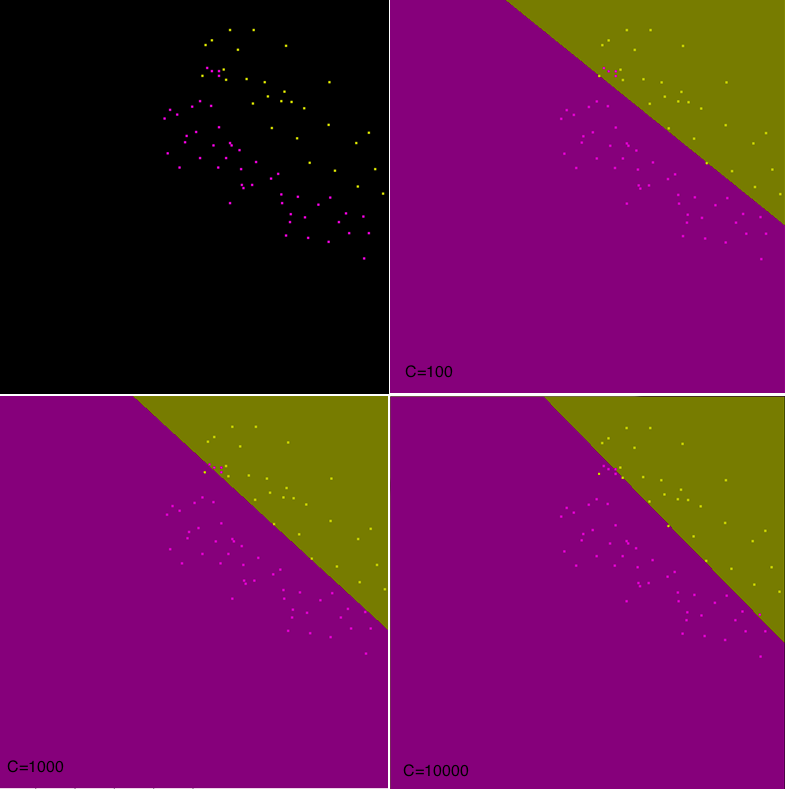 当\(\alpha_i=C\) 时,松弛变量\(\xi_i\) 不为零,此时其几何间隔小于\(1/\Arrowvert w\Arrowvert\) ,对应样本点就是误分点;当\(\alpha_i=0\) 时,松弛变量\(\xi_i\) 为零,此时其几何间隔大于\(1\Arrowvert w\Arrowvert\) ,对应样本点就是内部点,即分类正确而又远离最大间隔分类超平面的那些样本点;而\(0 < \alpha_i <C\) 时,松弛变量\(\xi_i\) 为零,此时其几何间隔等于\(1/ \Arrowvert w\Arrowvert\) ,对应样本点 就是支持向量 。\(\alpha_i\) 的取值一定是\([0,C]\) ,这意味着向量\(\alpha\) 被限制在了一个边长为\(C\) 的盒子里。 详细说明可参考:SVM学习——软间隔优化 。