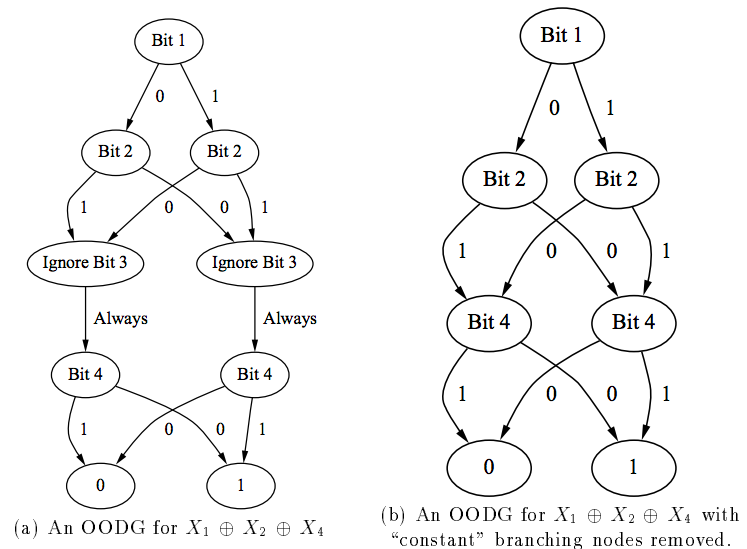 维度缩减 。此外Oblivious Tree也可以看做是Oblivious Oblivious Read-Once Decision Graphs的展开形式,如下图: