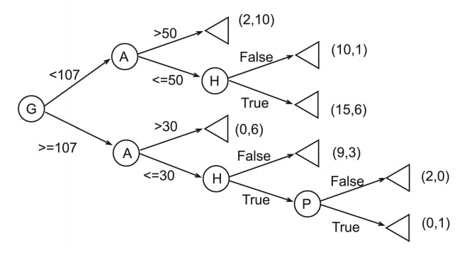 注意看,在age这个属性上,不同的路径可以有不同的判断条件,这种结构在特征选择上比较高效。再一个,每个到达叶子节点的路径上的分类变量都是一样的,这些变量一定是所有输入变量的子集,从这个角度看,其实是在做