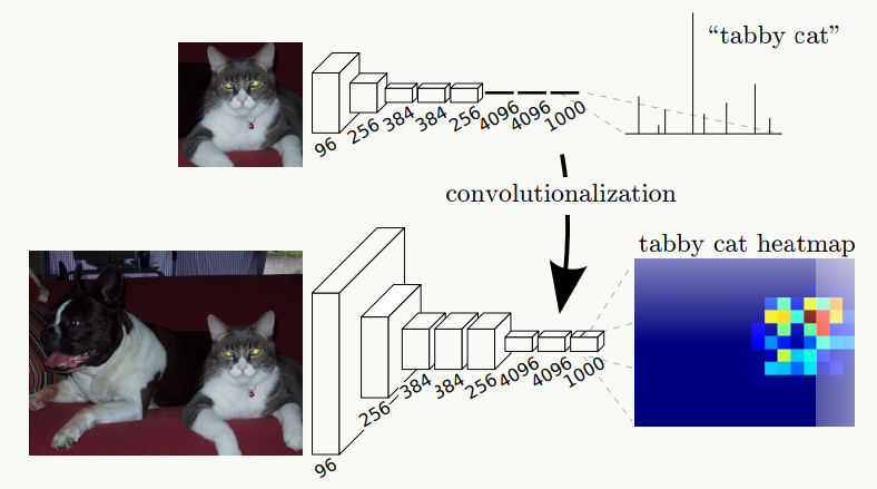 上图是传统CNN工作流程,下图是FCN工作流程,它最终可以得到关于目标的热图,这种变换除了在语义分割、检测、识别上用到,也会在feature map可视化上用来帮助分析特征。 一张图说明: