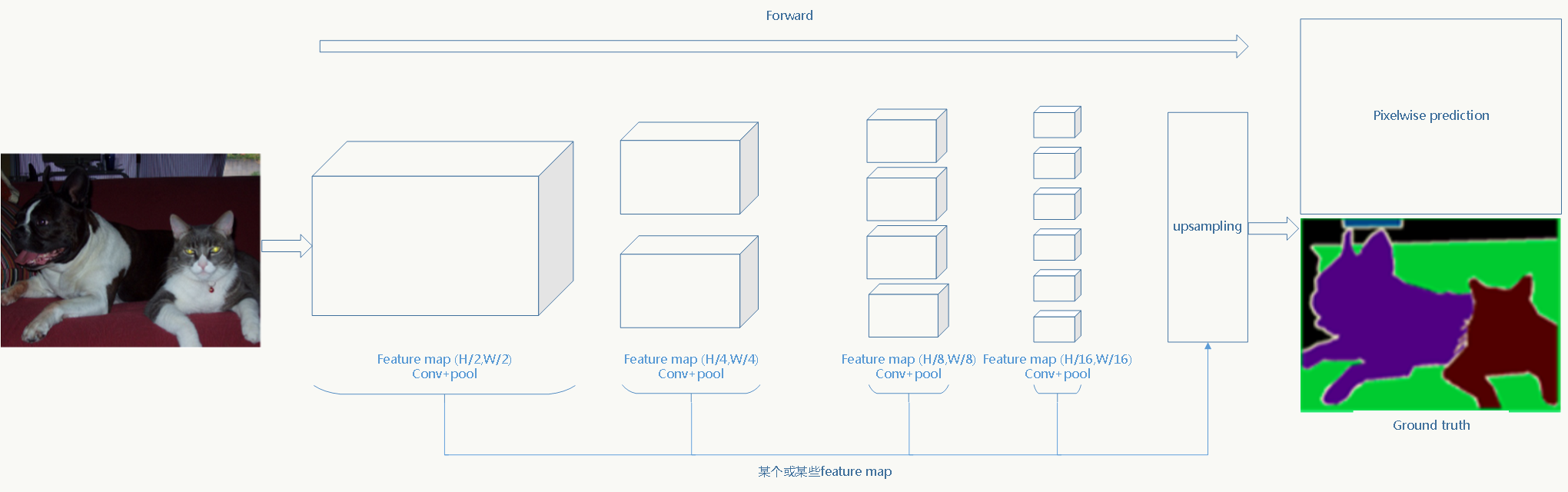做上采样 ,使其恢复到原始图片大小,这样不但保留了每个像素的空间信息,而且每个像素都会有一个分类预测。比如下图中pixelwise prediction那一层,小猫、小狗、电视、背景都会在像素级别做分类预测:
