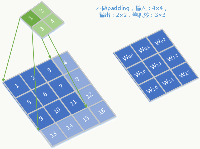 那么反过来,我们希望从4维向量映射回16维向量怎么做呢:把上面过程逆反一下(当然该做padding还得做): 前向传播: \[Y=W^T X \] 反向传播: \[ \frac{\partial E}{\partial X}=(W^T)^T\frac{\partial E}{\partial Y}=W\frac{\partial E}{\partial Y} \]